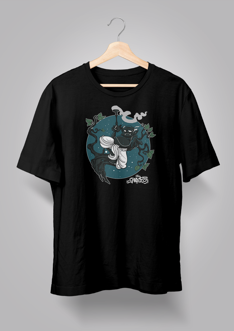 Dressed in the quintessential Bengali “Dhooti”, the Brahmyadaityo sits at the top of the ghost-life societal hierarchy. Believed to be the ghost of the Brahmins, in folklore and legends, Brahmyadaityos are usually considered to be kind, generous and benevolent. Get best quality bengali graphic t-shirt. The t-shirt comes in a very soft fabric which is very comfortable in any weather for men.