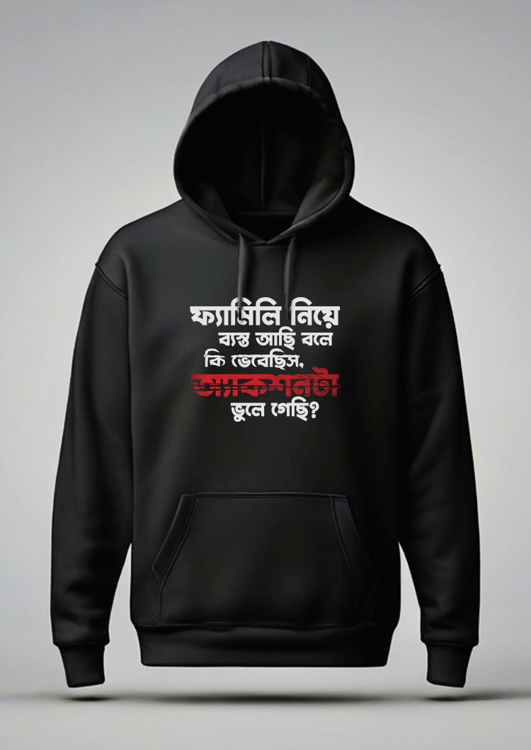 For those who used to be the light or main fun of any group, but now become a family person with full responsibility - it’s a loud out that they didn’t forget about fun actions. Translate to “Just because I'm busy with family, doesn’t mean I forget about my past actions” This hoodie features a quirky, expressive graphic that captures any Bengali's emotion and their great humor.