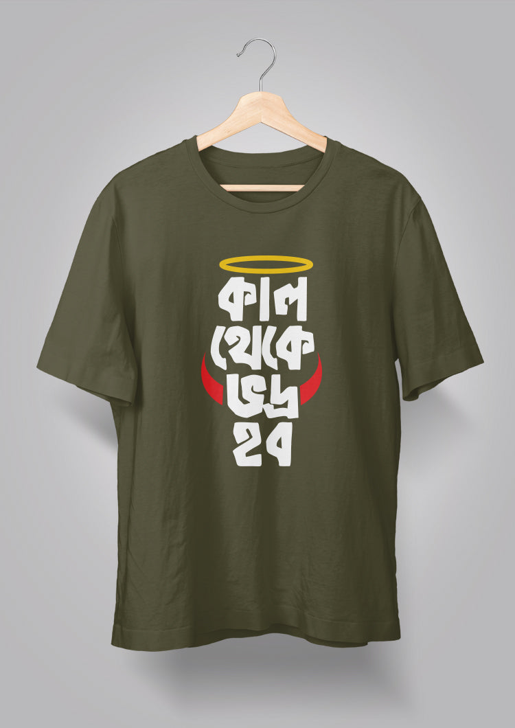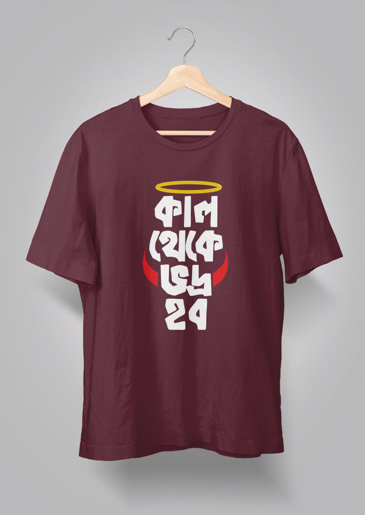 "Kal Theke Bhodro Hobo" is"Kal Theke Bhodro Hobo" a humorous phrase presented in a vibrant design. This unique Bengal graphic unisex T-shirt from Bongmade conveys the message that the wearer will become more refined starting the next day. However, today is an opportunity for enjoyment. This T-shirt is an excellent option for Generation Z individuals who appreciate a stylish and trendy appearance. Nevertheless, older adults can also wear it with assurance. The shirt offers a slightly quirky aesthetic as well. Additionally, it is crafted from 100% high-quality cotton, ensuring comfort for every individual based on appropriate sizing and color choices.
