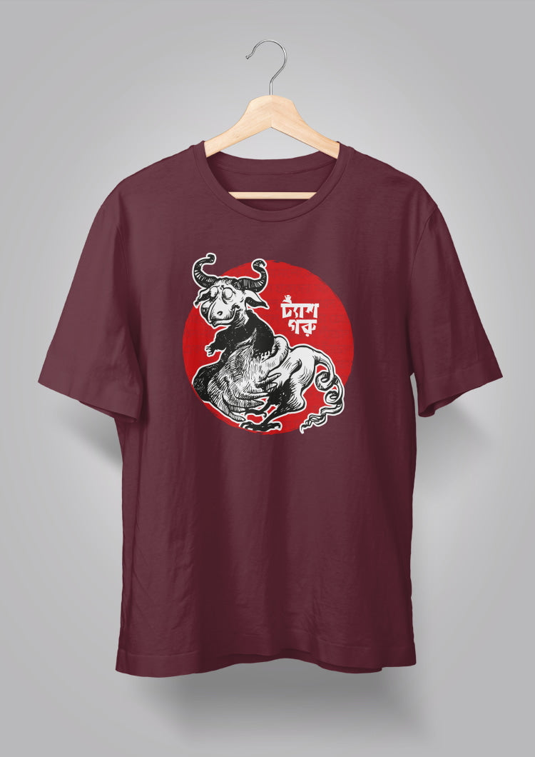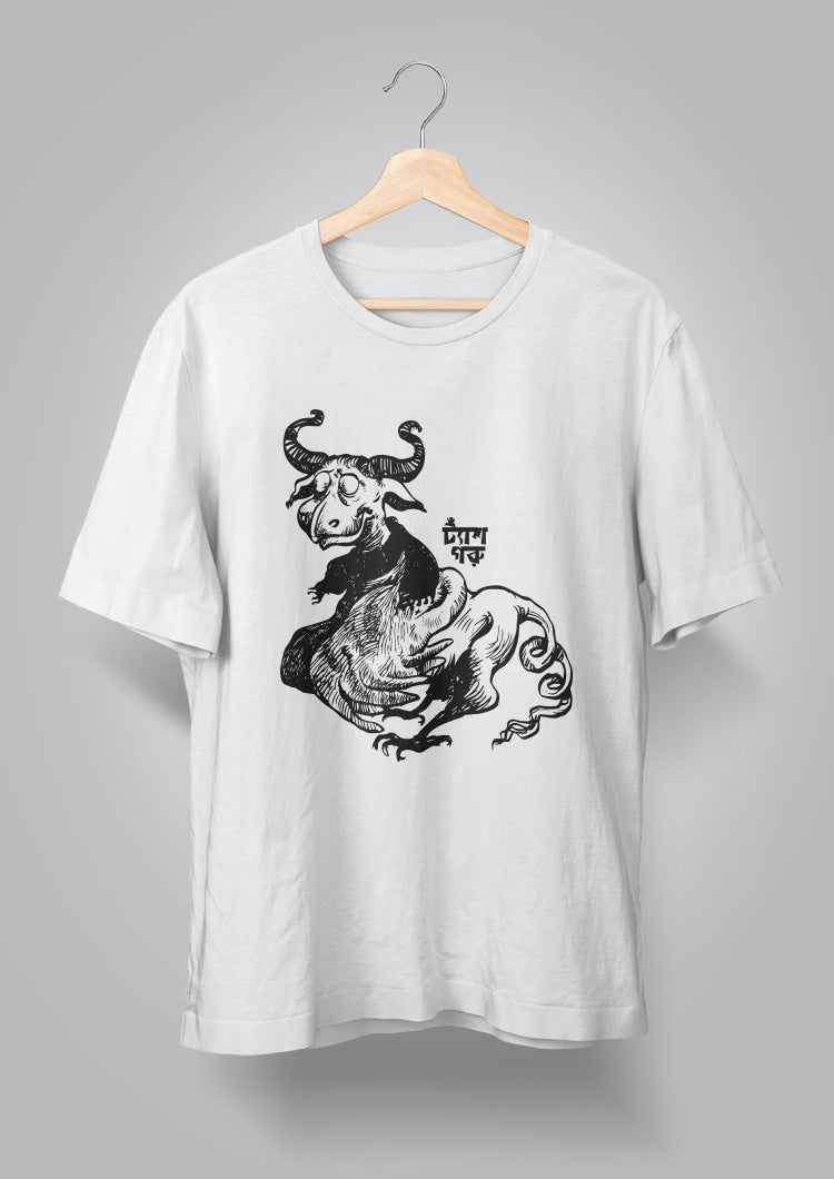 The "Tyash Goru" t-shirt, based on the well-known character from Sukumar Ray's Abol Tabol, will add a dash of rustic charm and lively vitality to your outfit. Mischief and curiosity are embodied by Tyash Goru, the quirky and charming cow from Ray's hilarious nonsense lyrics. Anyone who values comedy, originality, and a hint of absurdity will love this t-shirt's amusing and unique design. The "Tyash Goru" t-shirt, made of soft, breathable fabric, is ideal for people who enjoy the small things in life, whether it's the straightforward existence, a good chuckle, or the lighthearted nature of Ray's creations. This is for the free-thinkers, the thinkers, and everyone who likes to embrace the oddball aspects of life. Put it on and use Tyash Goru's charm to serve as a constant reminder to laugh, be curious, and have fun!